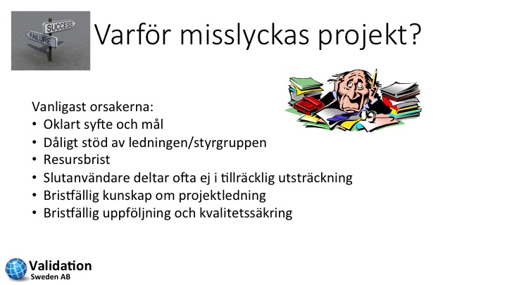 Kostnaden och frustrationen över ett misslyckat projekt är oftast omfattande och påverkar företaget och medarbetarna från många aspekter. Erfarenheten påvisar dock att vi tyvärr sällan lär oss av misstagen utan många misstag görs om igen. De vanligaste orsakerna till misslyckanden anses enligt branschforskning vara: